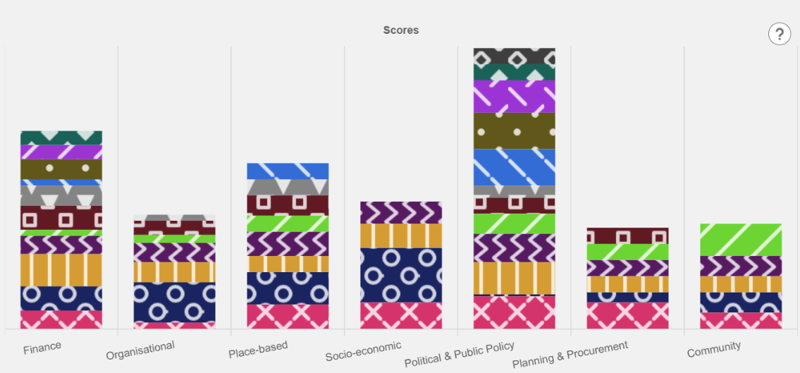 The tool calculates the current versus necessary activity as a rating. Throughout the session, live scoring will be displayed graphically against each pillar and cumulatively to enable users to prioritise activity across themes and consider the impact of different conditions.