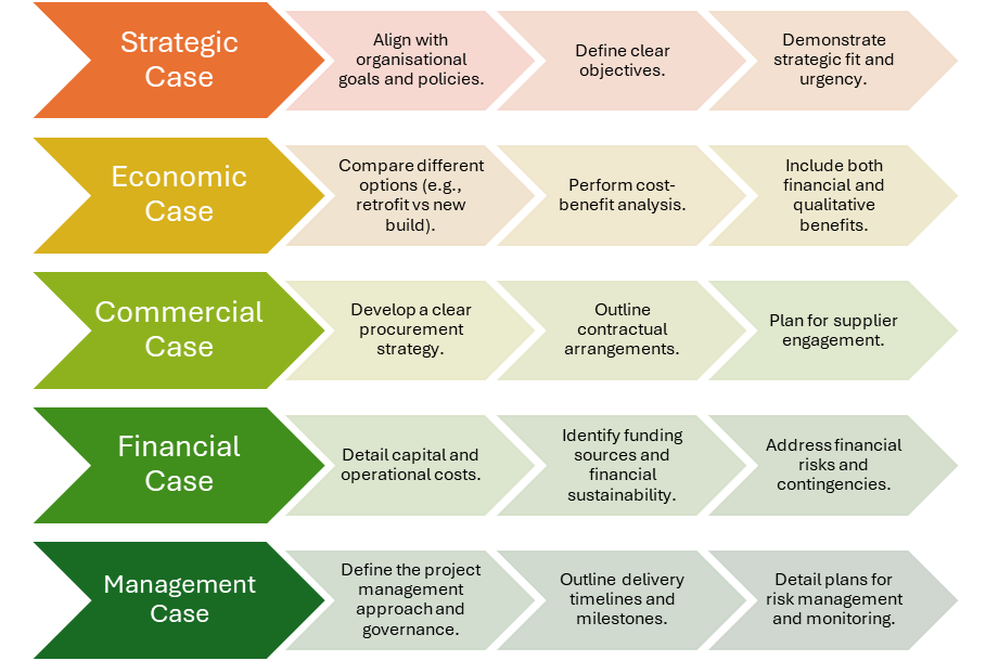 - Structured presentation: The Five Case Model provides a clear framework to present your project persuasively and is a widely recognised structure.