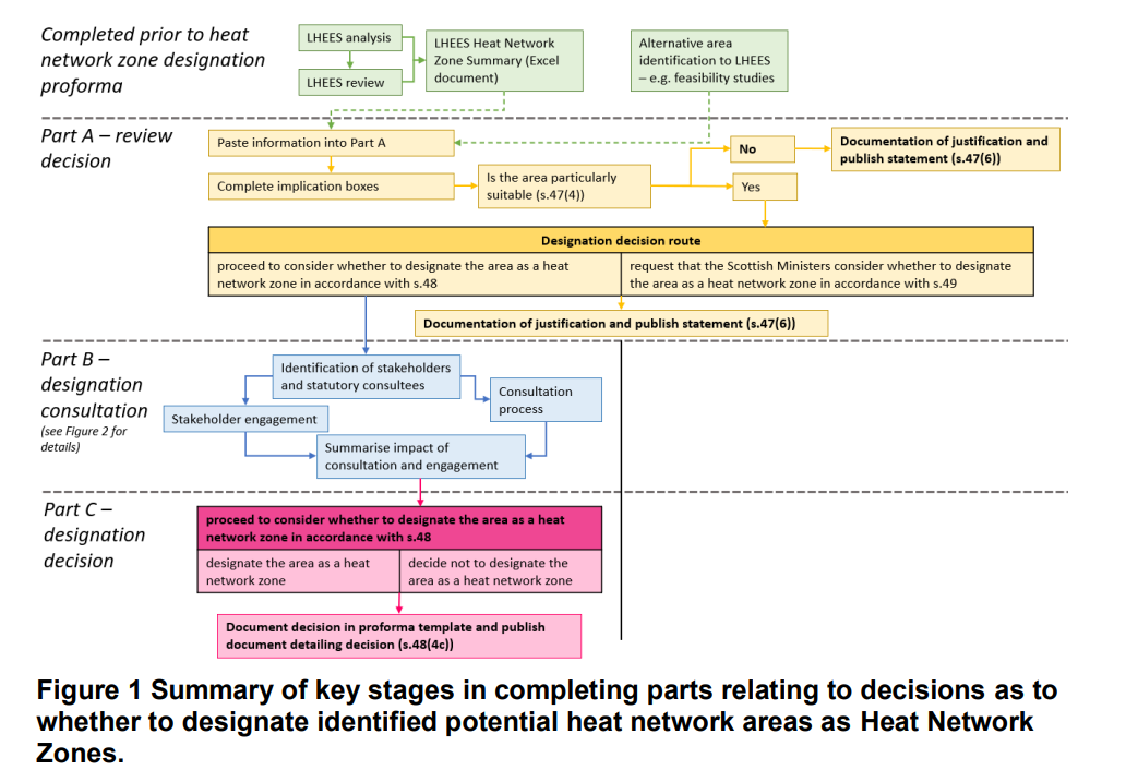 Within the Act, each local authority is required to carry out a review to consider whether one or more areas in its area is likely to be particularly suitable for the construction and operation of a heat network . Following this review by a local authority, a further requirement of the Act is to make a decision on whether either the local authority itself or the Scottish Ministers should proceed to consider designation of areas as Heat Network Zones.