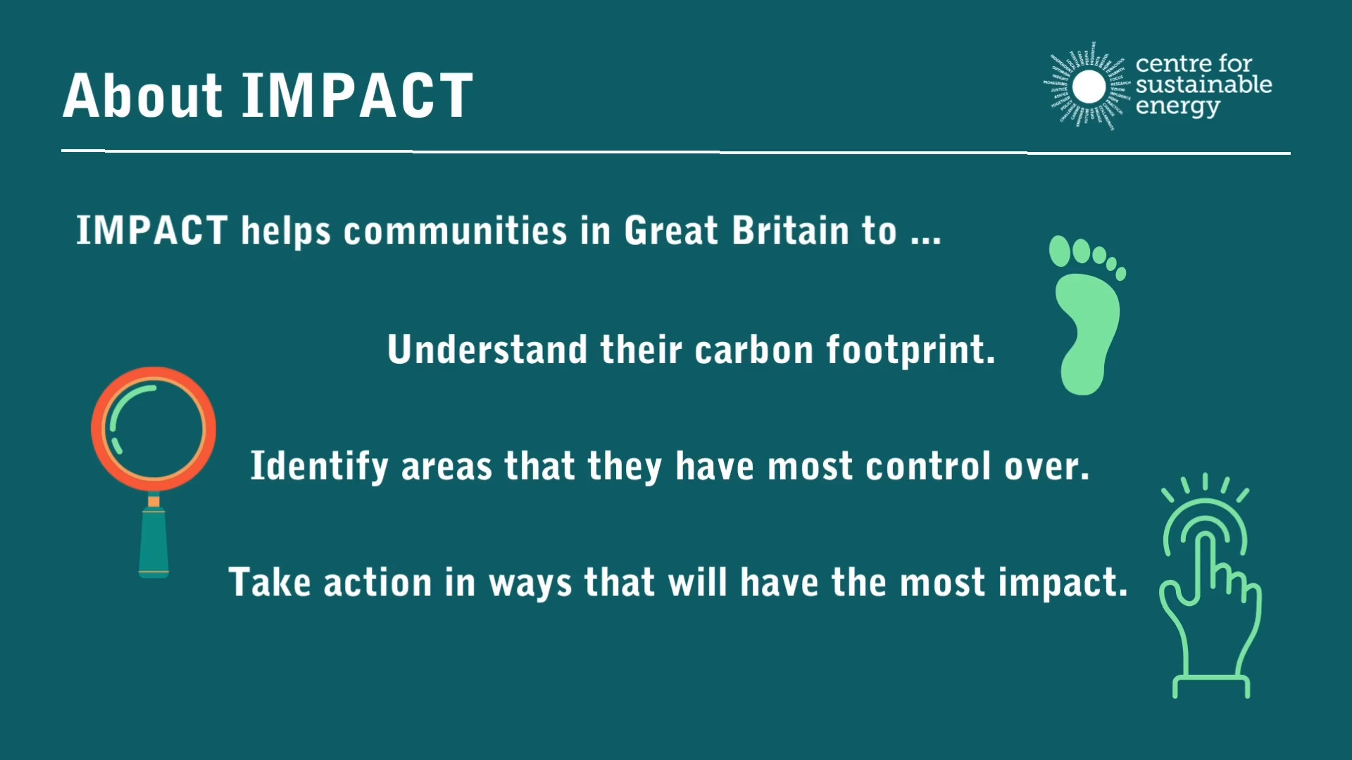 IMPACT has been designed to help you and your community to access, analyse, and act on your community’s carbon footprint and to give you a better idea of where to target your efforts for the greatest impact in tackling the climate emergency.