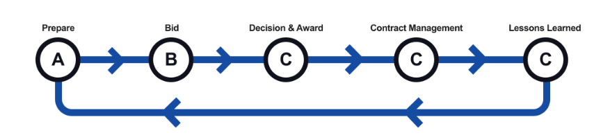This Supplier Journey is laid out in an interactive “journey” fashion i.e. information is listed in a series of chronological stations (or pages) – from preparing a bid right through to lessons learned at the end of a contract.